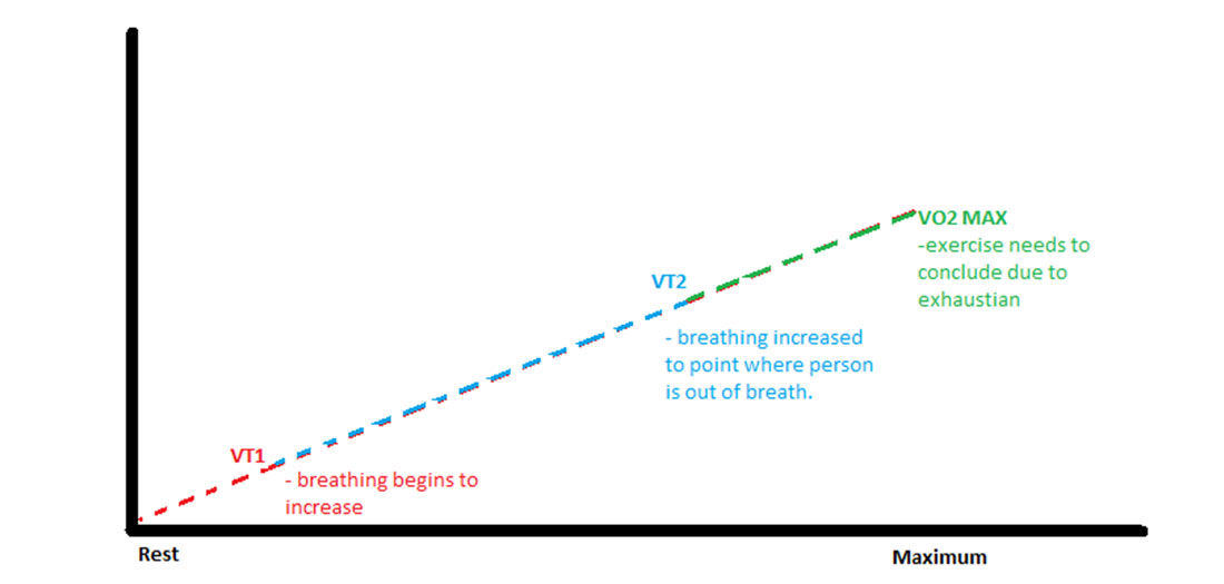 A sedentary person will reach VT1, VT2, and VO2 max at a much lower intensities of exercise than a more physically active person. For example, an extremely deconditioned person may reach his or her VT1 while just walking. Conversely, a more conditioned person will reach these markers at a higher intensity. For example, he or she may reach VT1 at a running speed of 6 miles per hour.